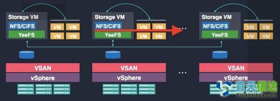 VNAS是運行在VMware虛擬中的一種NAS虛擬化服務(wù),它的部署非常簡單,利用VSAN虛擬出來的硬盤,通過VMware的vSphere一鍵操作即可完成部署。其核心是達沃自主研發(fā)的分布式文件系統(tǒng)YeeFS,對外提供標準的NFS/CIFS接口,以及集群式NAS服務(wù)。由于它與VSAN運行在同一個宿主機上,即使VMs遷移了,還是可以實現(xiàn)對StorgeVM的就近訪問,與VMs位置無關(guān)。另外,通過創(chuàng)新數(shù)據(jù)調(diào)度等技術(shù),VNAS提供全活集群的保障機制,因此當(dāng)本地StorgeVM故障時,VMs仍可以通過其他Host上的StorgeVM繼續(xù)訪問相關(guān)數(shù)據(jù)。當(dāng)然,VNAS對故障的判斷,需要VSAN提供相應(yīng)的物理資源信息。